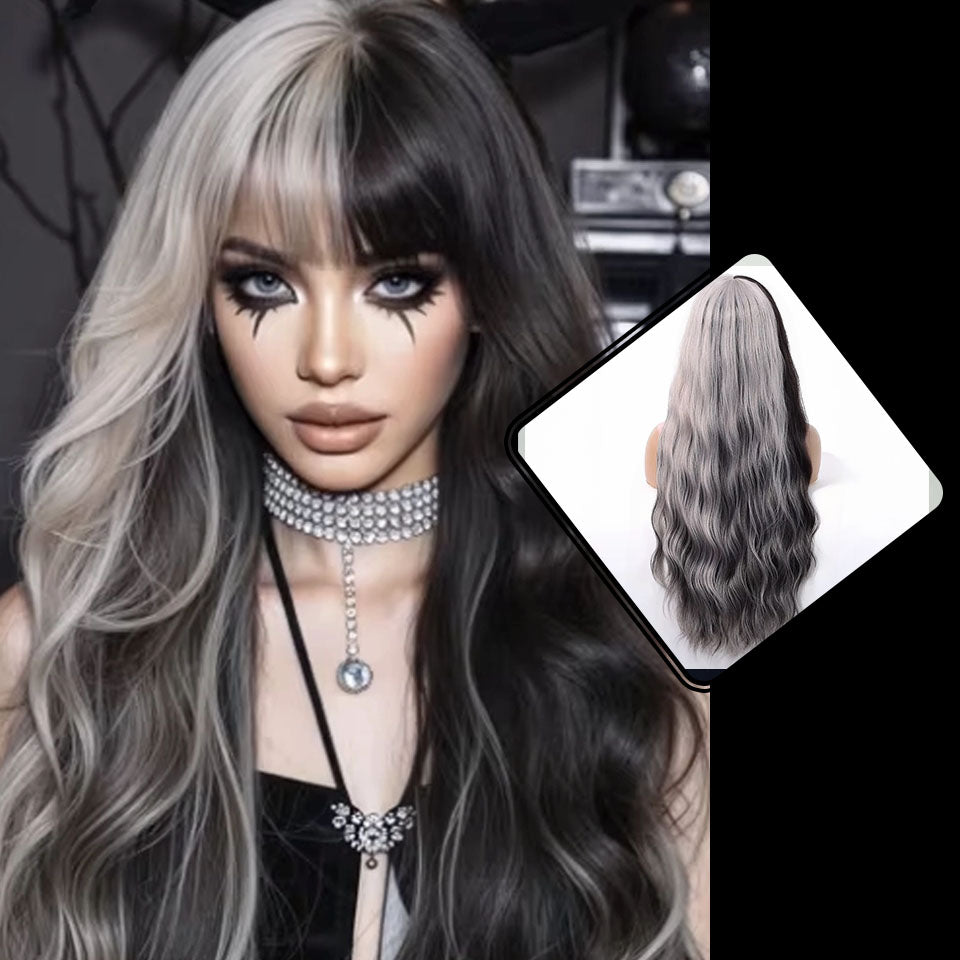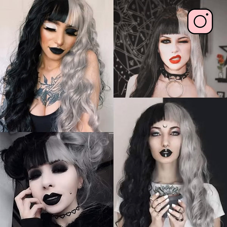 Deze opvallende pruik combineert gitzwarte en spierwitte lokken tot een onweerstaanbare gothic look. De zachte golven en contrasterende kleuren zorgen voor een dramatisch effect, perfect voor wie durft op te vallen.